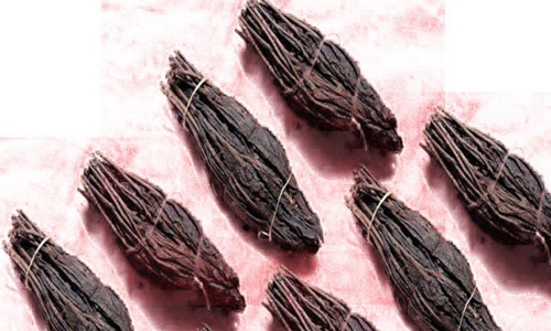 龍須茶具有工藝晶的性質(zhì),它對外形的要求極高,茶束的外觀形狀,必須滿像蘸墨汁而直立的短毛筆,色呈墨綠,長約二寸八分,最大處周圓約二寸半,不宜過大或過小,四十至五十個干茶束約重一斤。茶束分單束和雙束兩種,均扎以鮮艷的紅、綠絲線。