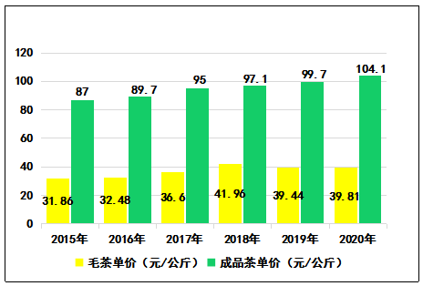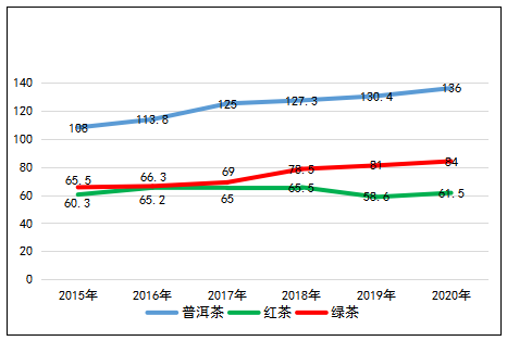 2020年,普洱茶平均單價139元/千克,比2019年增長4.3%,紅茶平均單價61.5元/千克,比2019年增長4.9%,綠茶平均單價84元/千克,比2019年增長3.7%。“十三五”期間,普洱茶、綠茶價格年均增長率分別為4.7%、5.1%,均呈穩(wěn)步增長,紅茶年均增長僅0.4%。