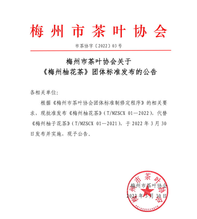 梅州市茶葉協會關于 《梅州柚花茶》團體標準發(fā)布的公告